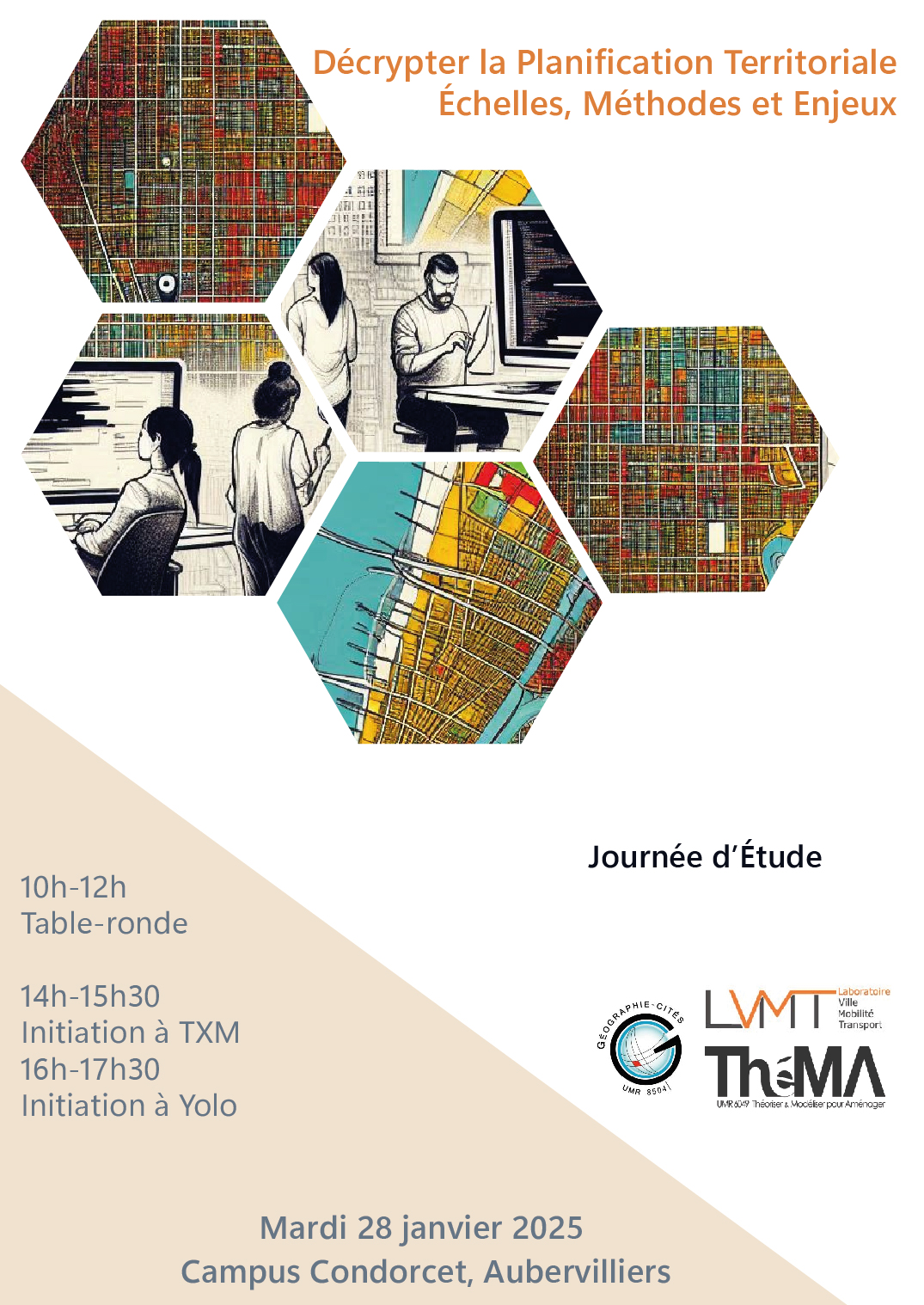 Cette journée d’étude s’est déroulée le mardi 28 janvier 2025 sur le Campus Condorcet. Il a été l’occasion de discuter des méthodologies possibles pour analyser les politiques de planification à différentes échelles. Plusieurs grilles de lecture qui ont été appliquées à différents types de document de planification ont été explorées et les intervenants ont été amenés à réfléchir aux apports et aux limites des approches qualitatives et quantitatives.
